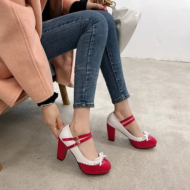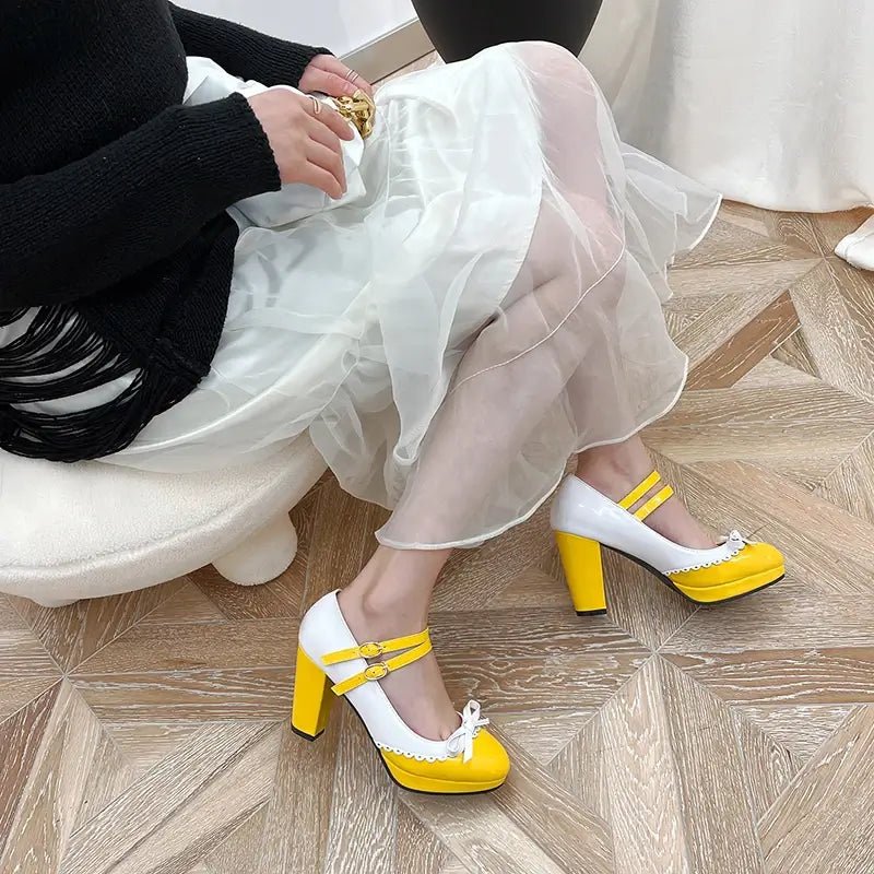 Redécouvrez l'élégance intemporelle avec ces escarpins rétro à double bride, inspirés du style Mary Jane classique des années 50. Ce modèle bicolore noir et blanc revisite les codes vintage avec une touche moderne et féminine : un bout arrondi verni, une jolie découpe festonnée, un petit nœud délicat et deux fines brides avec boucles dorées.